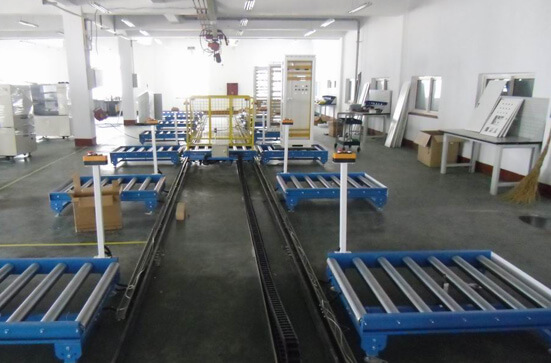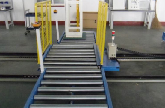 貨物從工位線輸送到往復(fù)雙向輸送軌道車。