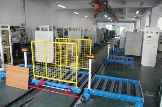 往復(fù)雙向輸送軌道車往復(fù)移動(dòng)到工位線,準(zhǔn)備對(duì)接輸送。