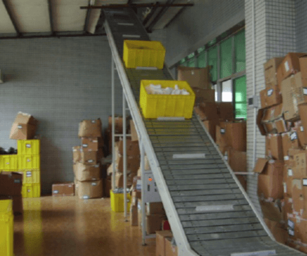 某企業(yè)金屬鏈板輸送機(jī),周轉(zhuǎn)箱內(nèi)放置小包裝物品進(jìn)行輸送,鏈板配擋條實(shí)現(xiàn)周轉(zhuǎn)箱爬坡功能。